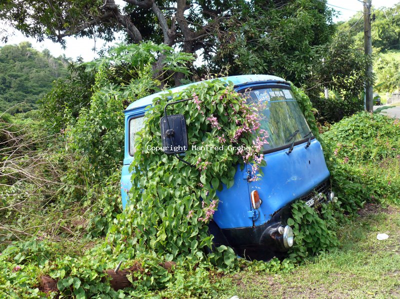 Auf Grenada erobert sich die Natur dieses Autowrack.