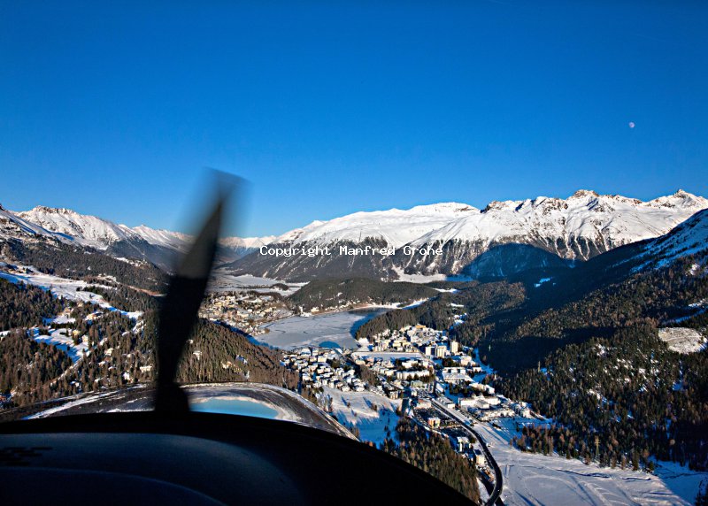 Anflug auf den Flughafen Sankt Moritz im schweizerischen Engadin